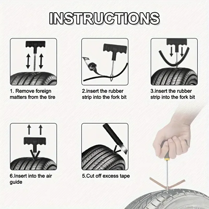 6-Piece Set Details- T-Shaped Dual-Purpose Tool: Two T-handled tools, one with a drill bit (for drilling tire holes) and the other with an awl bit (for applying tire sealant strips).- Tire Seal Strips: Five strong rubber strips fill tire holes and securely seal leaks.- Protective Gloves: Protect your hands from scratches and stains from the tire sealant strips while repairing tires.- Needle-Nose Pliers: For gripping tire sealant strips and removing small stones and debris from tires, providing a super convenient aid for tire repairs.- Utility Knife: For cutting tire sealant strips to desired lengths. The sharp blade allows for quick cutting.